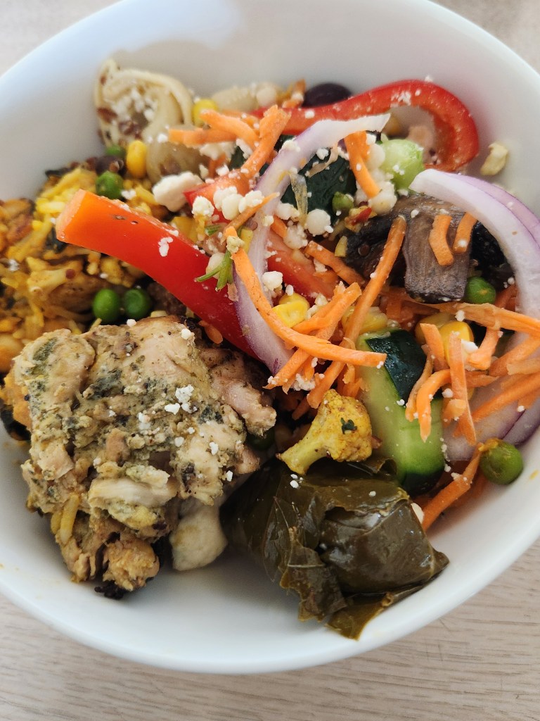 Inside was heavenly. I grabbed a large cardboard container, and filled it with all manner of vegetables (all ones good for my kidneys, like cabbage, onions and cauliflower), tortellini, dolmades, falafel, grapes, rice, baked chicken, quinoa and some casserole type action.