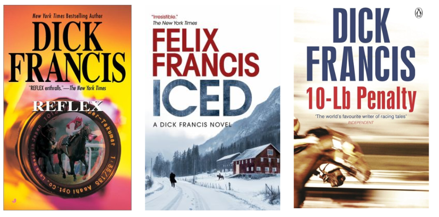 I’ll close with my first and longtime favorite mystery writer, Dick Francis, the Queen’s WW2 era champion jockey, and mystery writer. His wife did a lot of ghostwriting for him without credit, he conceived of dozens of great writings concerning horseracing, intrigue and mystery, and his son, Felix, has penned some great volumes as well, a family affair: